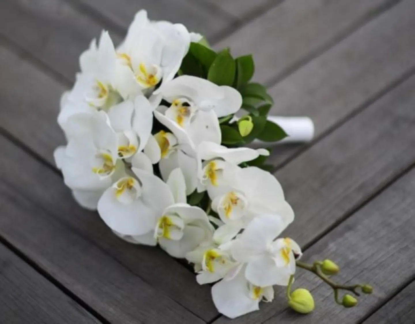 白のデンファレ(花器中小)x9個、ロングキャンドルスタンド、ベージュのテーブルランナーを使用(~6名程度のテーブルに最適)