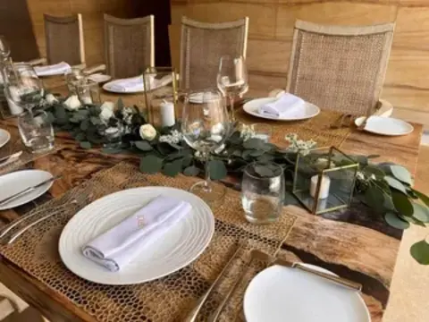 ユーカリの葉、白バラ、白小花、フローティングキャンドルを使用(~6名程度のテーブルに最適)