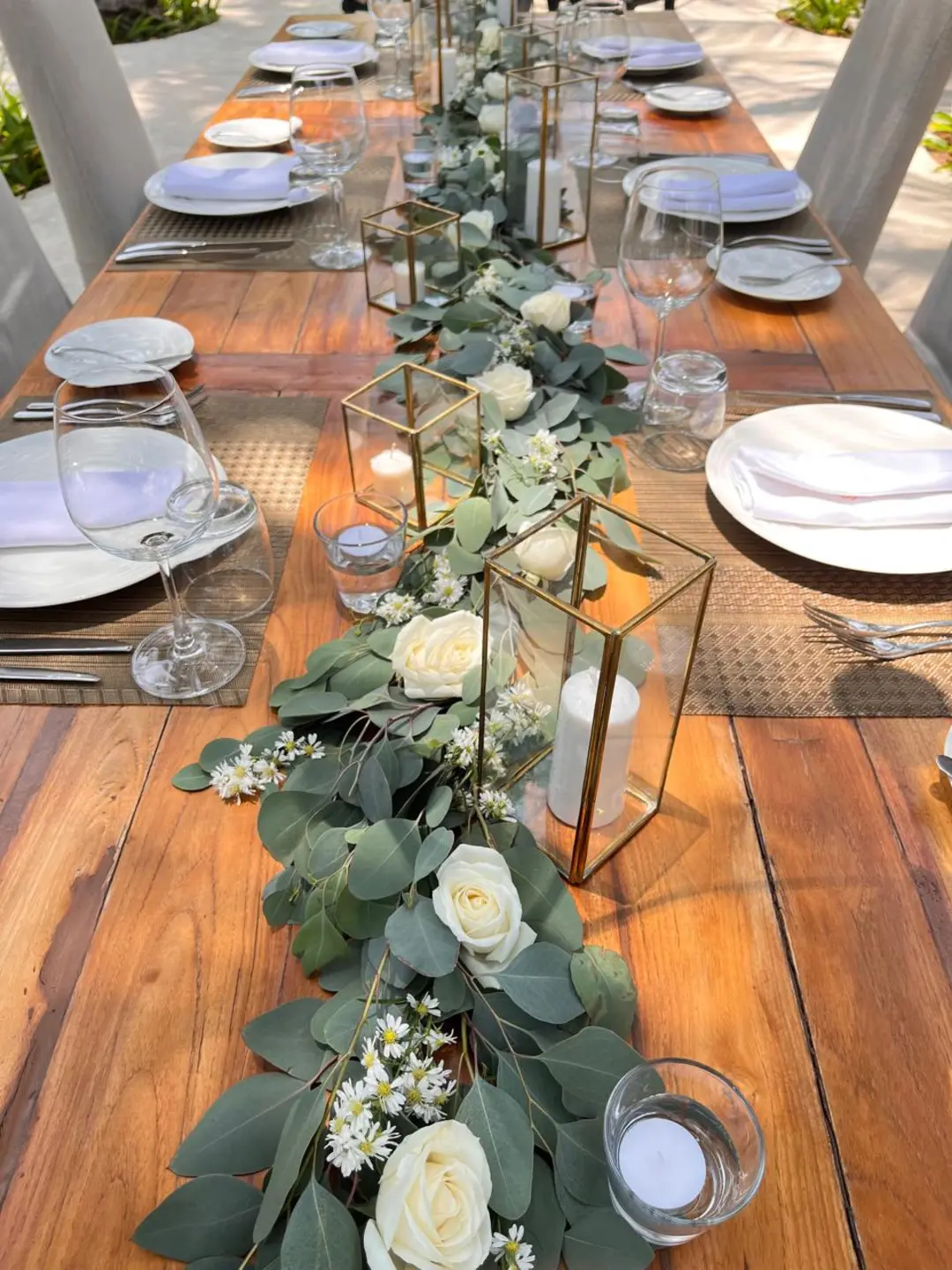 ユーカリの葉、白バラ、白小花、フローティングキャンドルを使用(~6名程度のテーブルに最適)